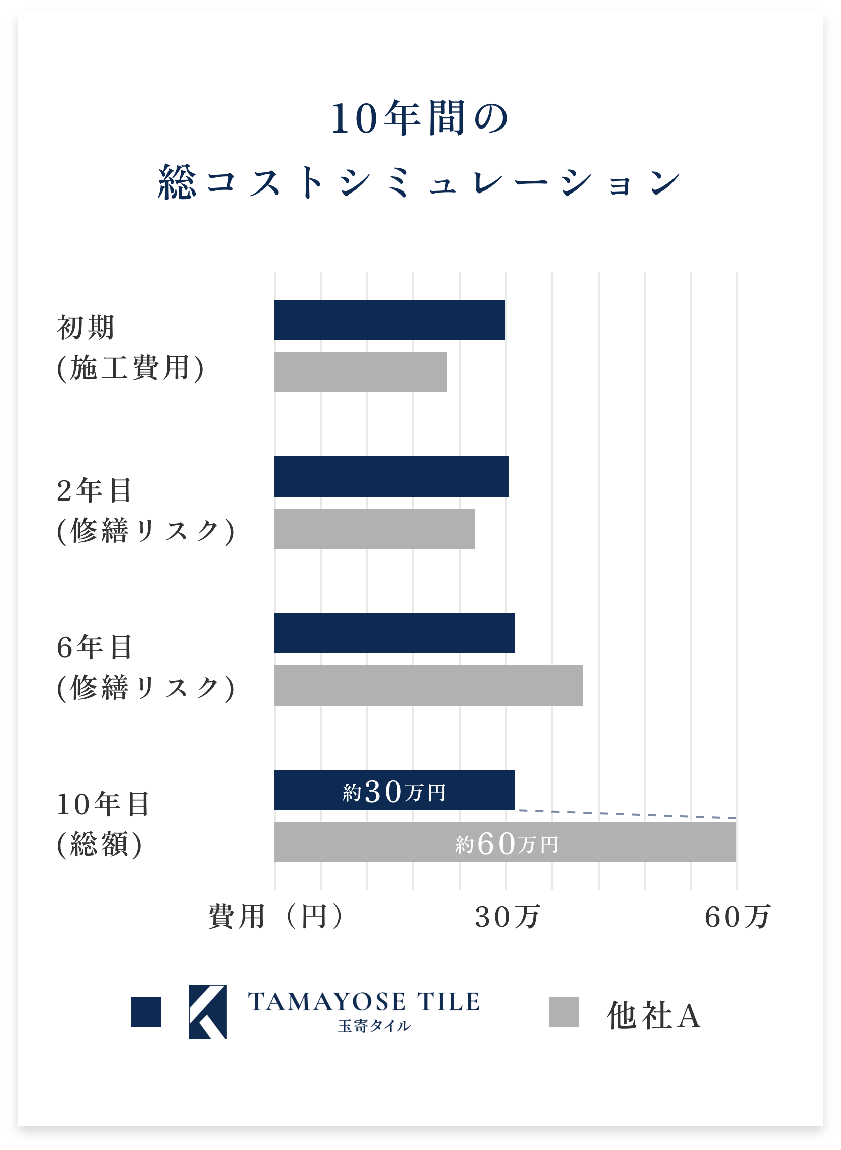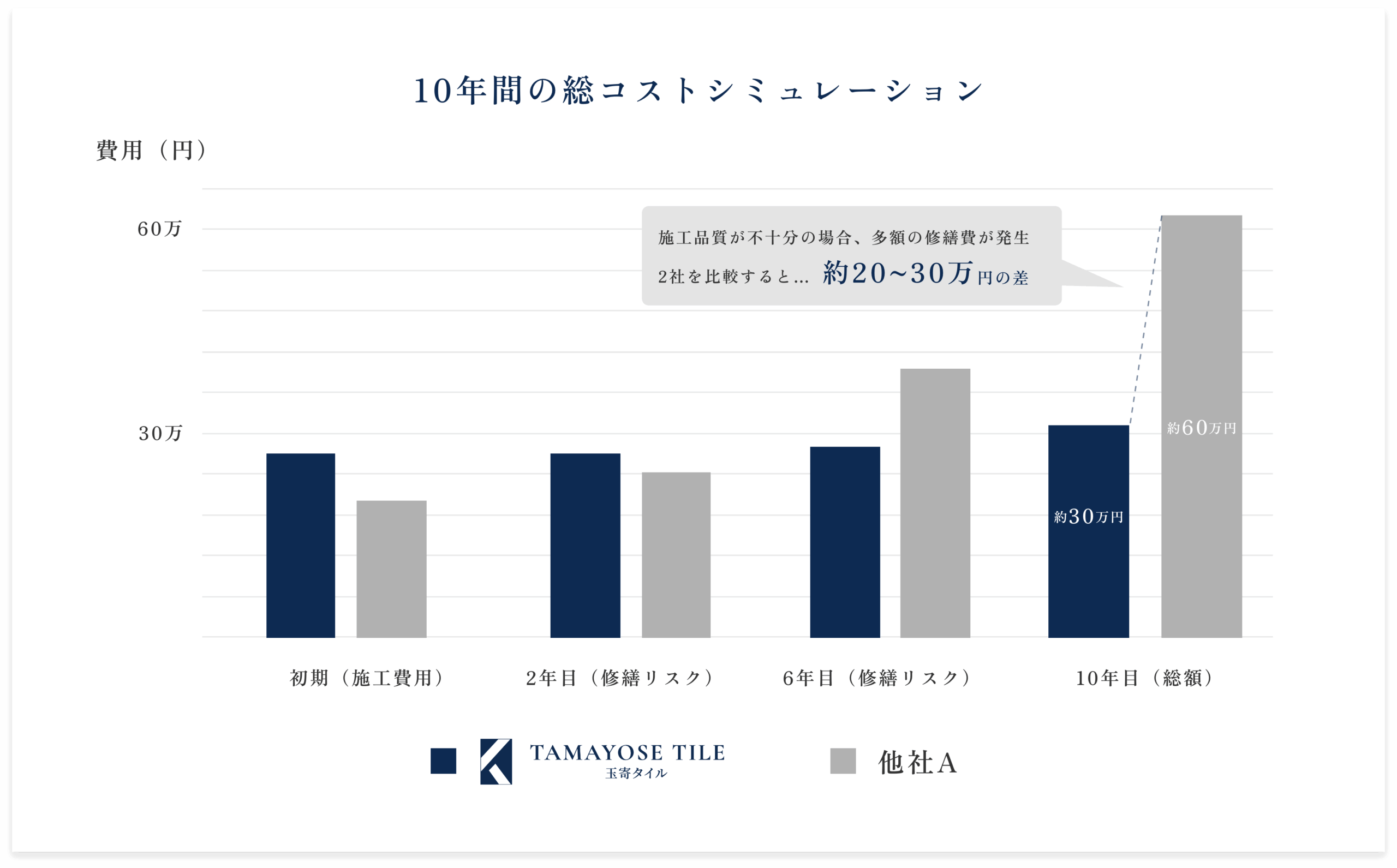 玉寄タイルの施工は「施工やり直しゼロ」を維持しており、長く安心して使えるため、結果的に 長期的なコストを抑えることができます。