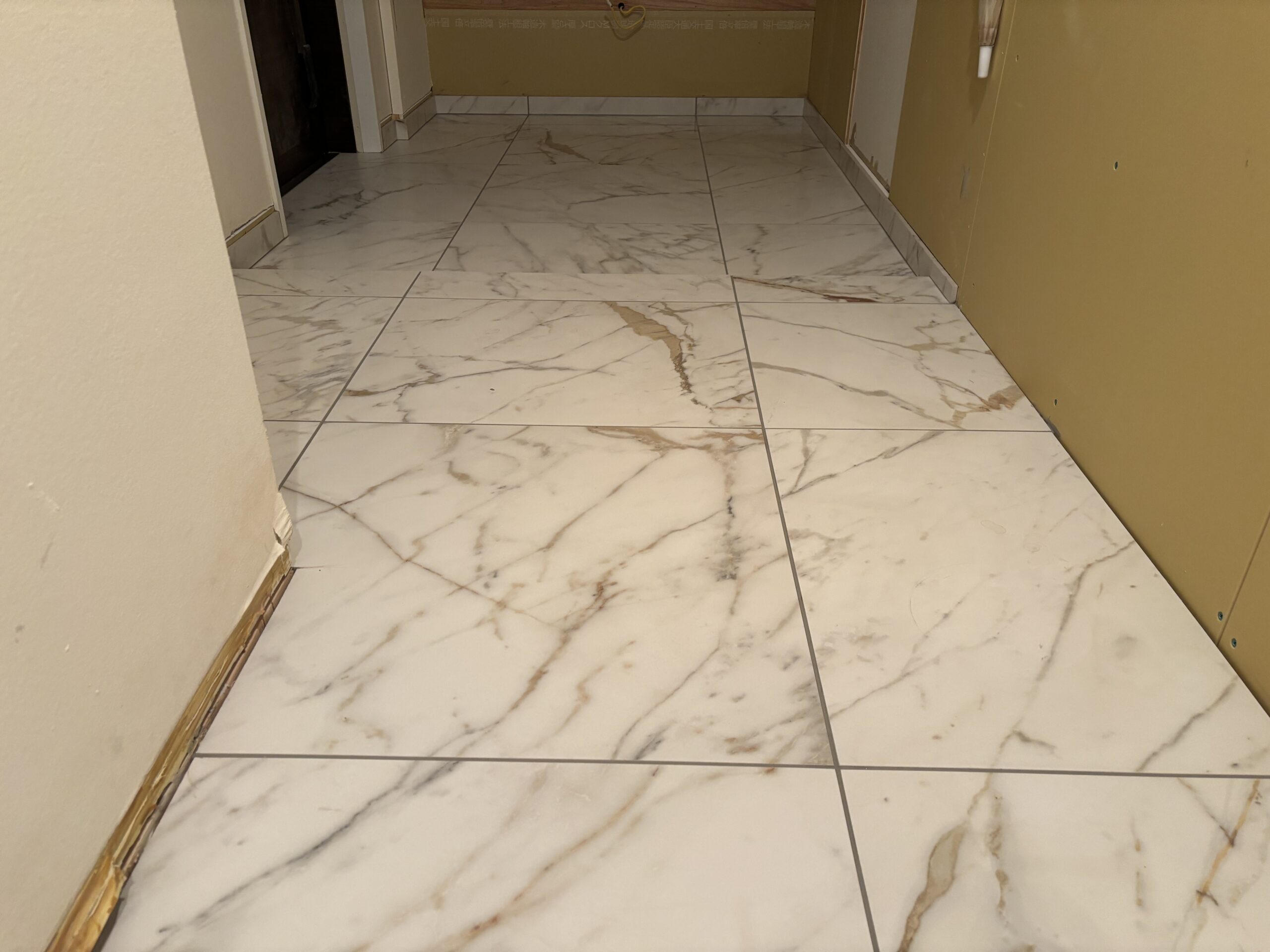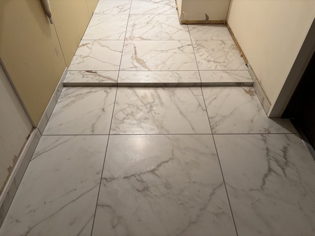 床材には高級感と耐久性に優れた600角大判タイル(大理石調)を使用。
