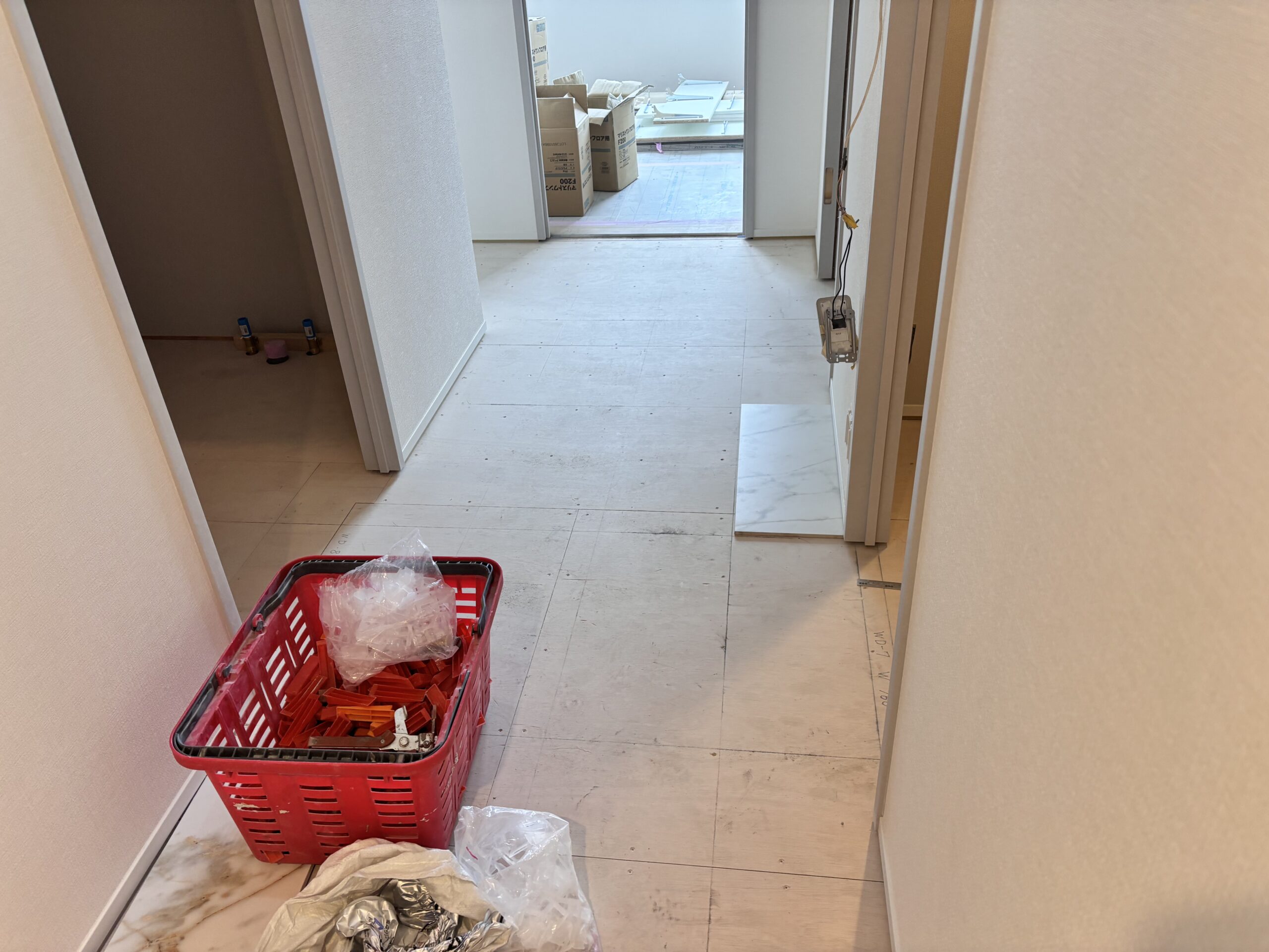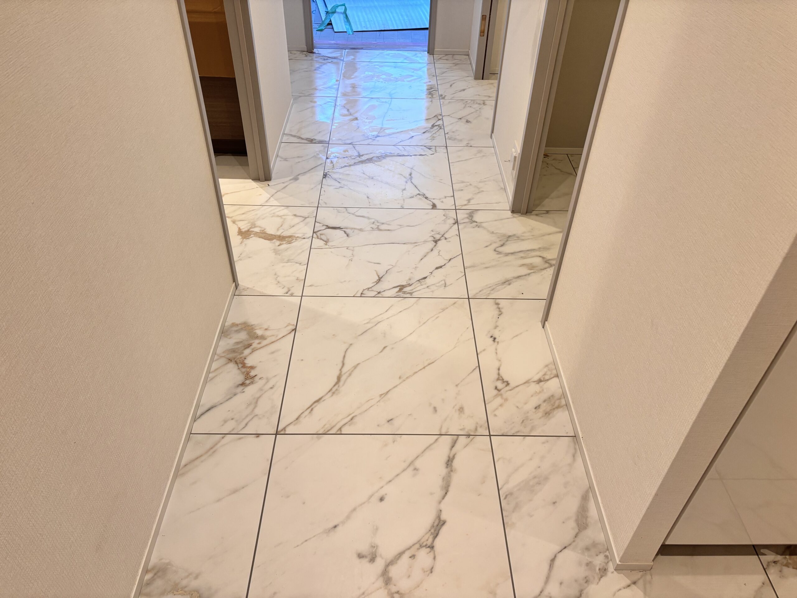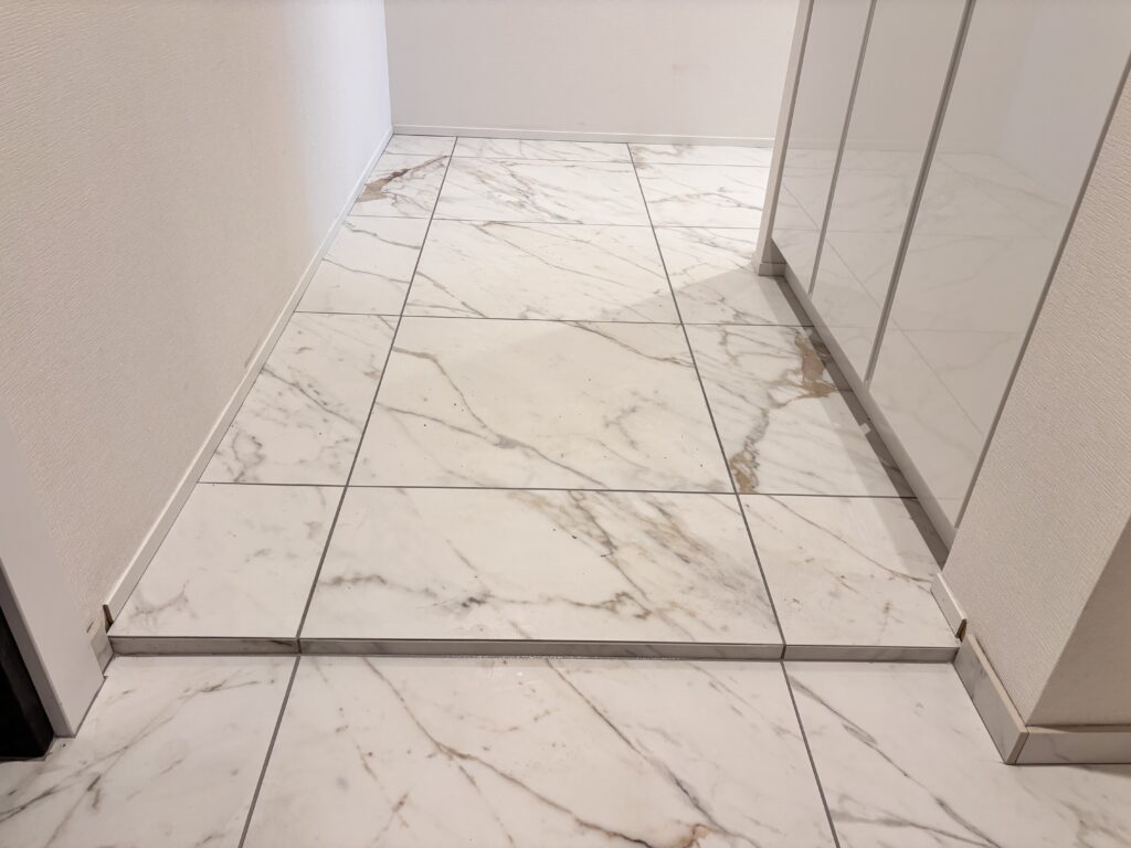 今回の施工では、玄関・廊下・脱衣所・トイレまでの床を600角タイルで統一し、